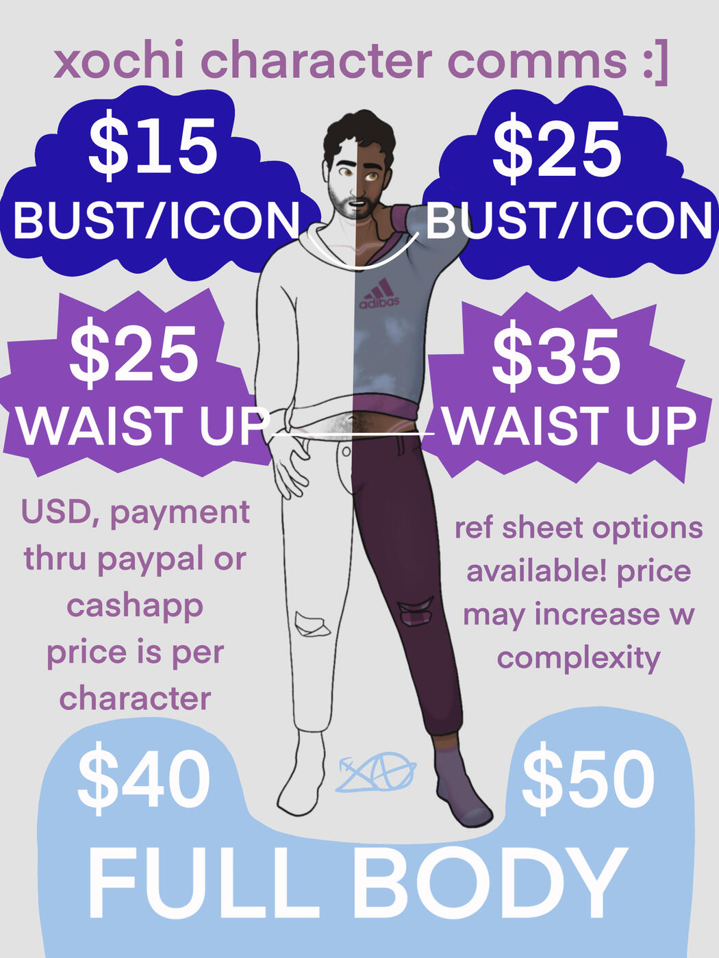 payment is thru paypal, venmo, or cashapp, half up front is needed before i start sketching, other half needed after i finish before u receive the final piece